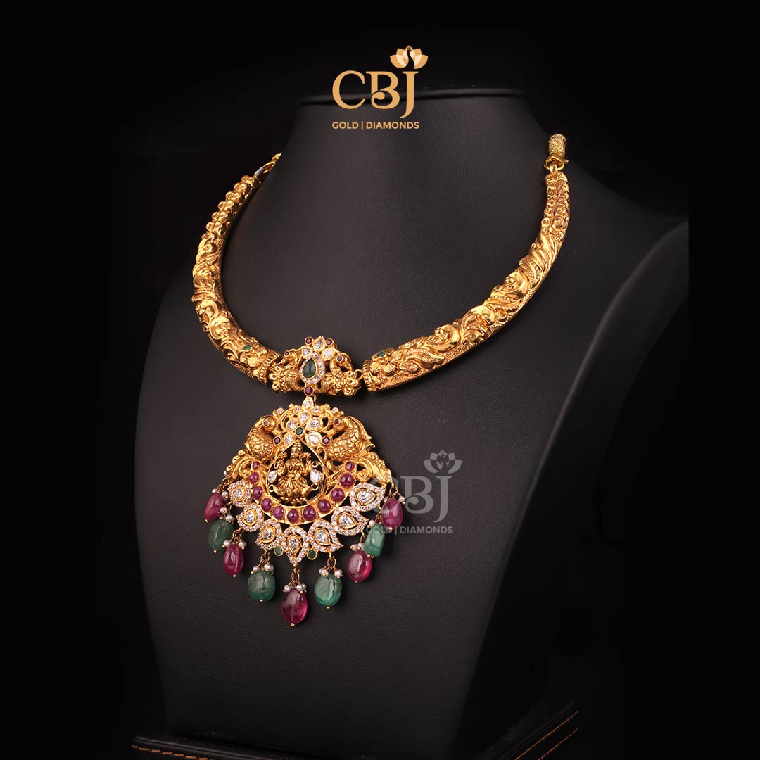 An alluring CZ Pachi Kante featuring a Lakshmi centrepiece decorated with beads.