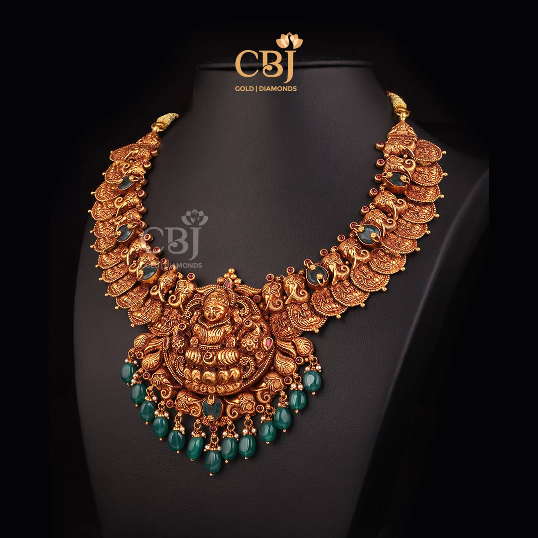 An awe-inspiring antique Lakshmi kasumala design embellished with pearls and emeralds.