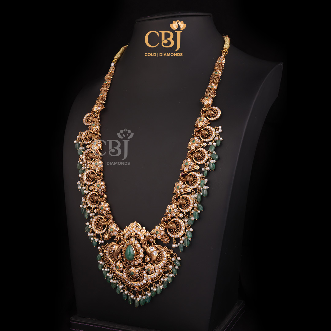 A prestine CZ pachi crescent shaped long haram embellished with emeralds and pearls.